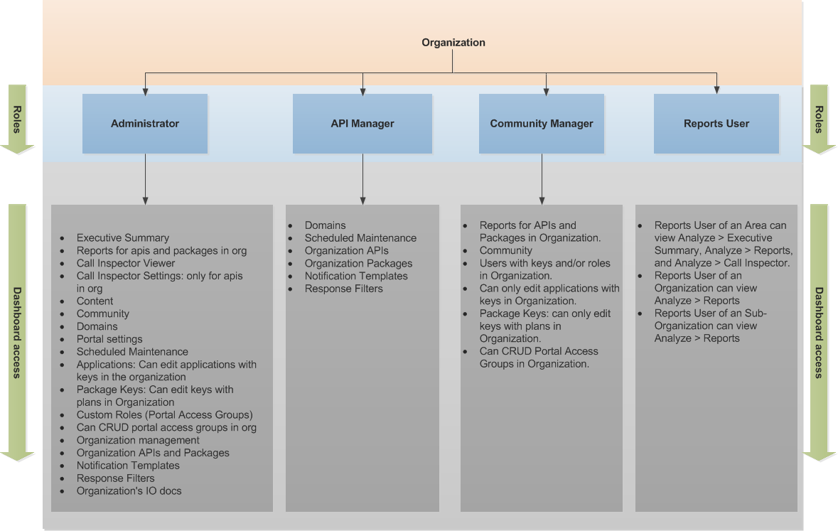 Organization Community ManagerThey can view and modify Reports for APIs and Packages, Community, Users with keys and/or roles, Applications, Package Keys, and add users to Portal Access Groups in an Organization and its Sub-Organizations on the Cloud API Management dashboard.