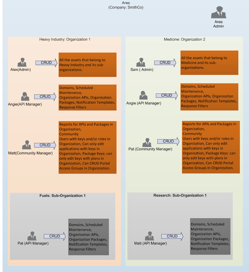Area AdministratorThey can view and modify all the resources on the Cloud API Management dashboard within the Area, Organizations, and Sub-Organizations, and can create Organizations, Sub-Organizations, and Portal Access Groups for Organizations and Sub-Organizations.
