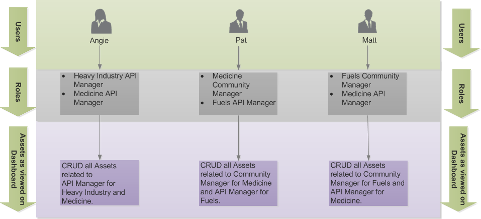 In the above example, Angie, Pat, and Matt are the users who belong to different Organizations and Sub-Organizations. Based on the roles, these users will view specific assets on the Control Center Dashboard and can perform CRUD operations accordingly. The following diagram explains role-based Control Center visibility for Angie, Pat, and Matt.
