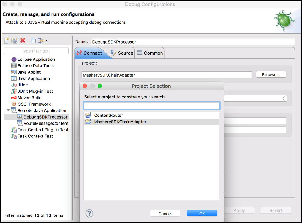 In the Connect tab, click Browse to select the Project. In the Project Selection window, select the SDK Processor's project.