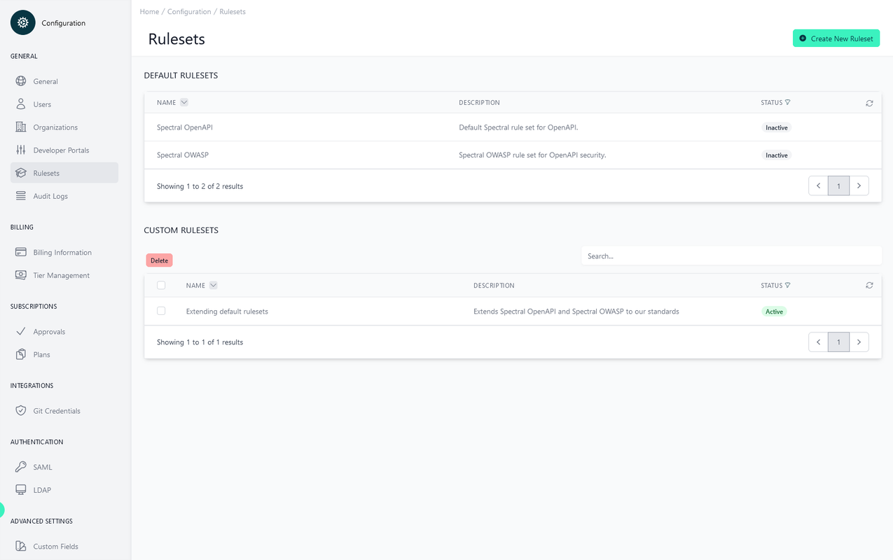 Some rulesets are available in API Control Plane by default, but it is also possible to add custom rulesets. Each ruleset can be enabled/disabled individually, however at least one ruleset must be enabled at all time. If you attempt to disable all rulesets, the default ruleset ‘Spectral OpenAPI’ will be automatically enabled.