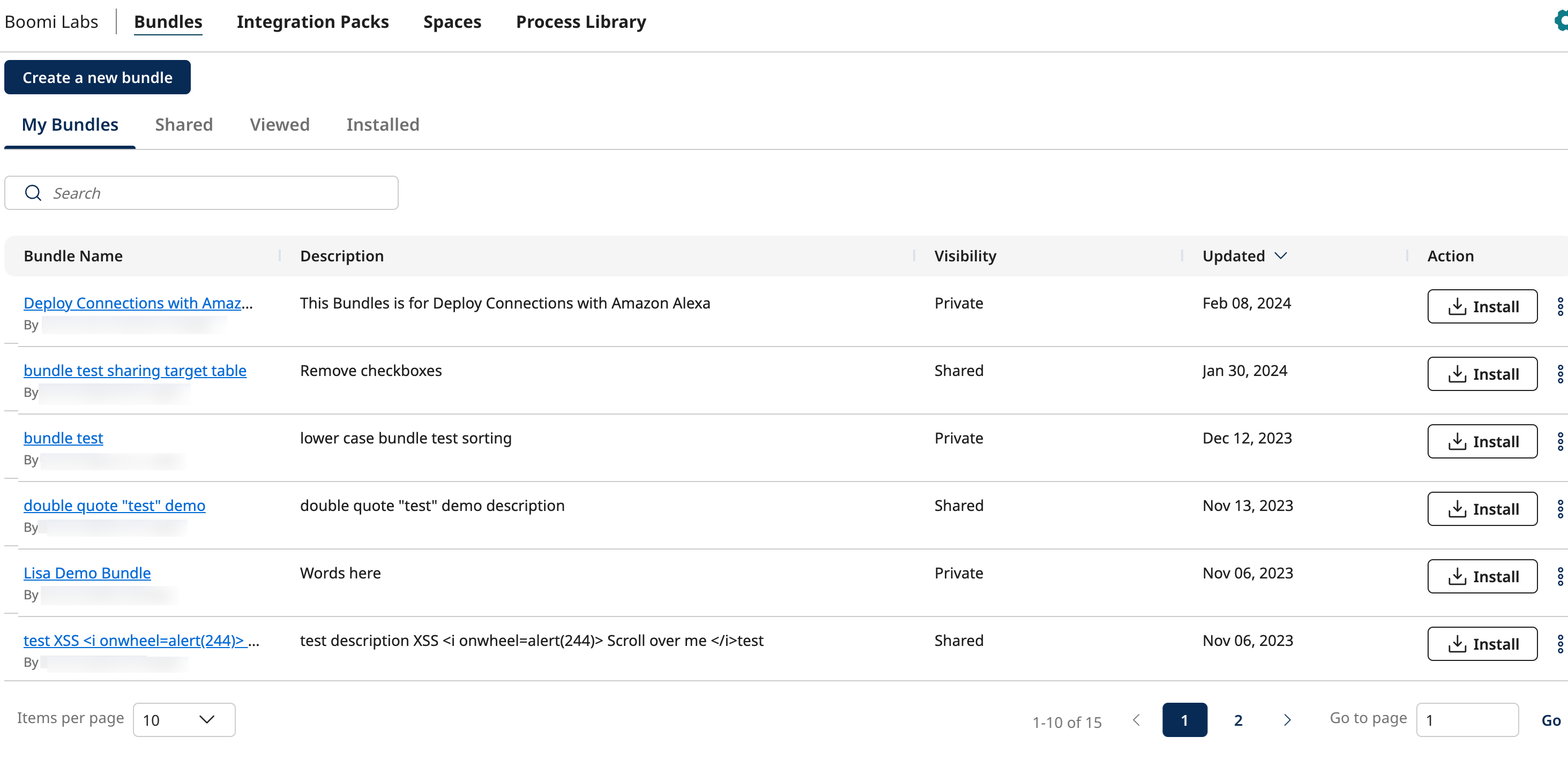 The Shared tab tab displays all the Bundles shared with the account. You can install any Bundle listed in the Shared tab.