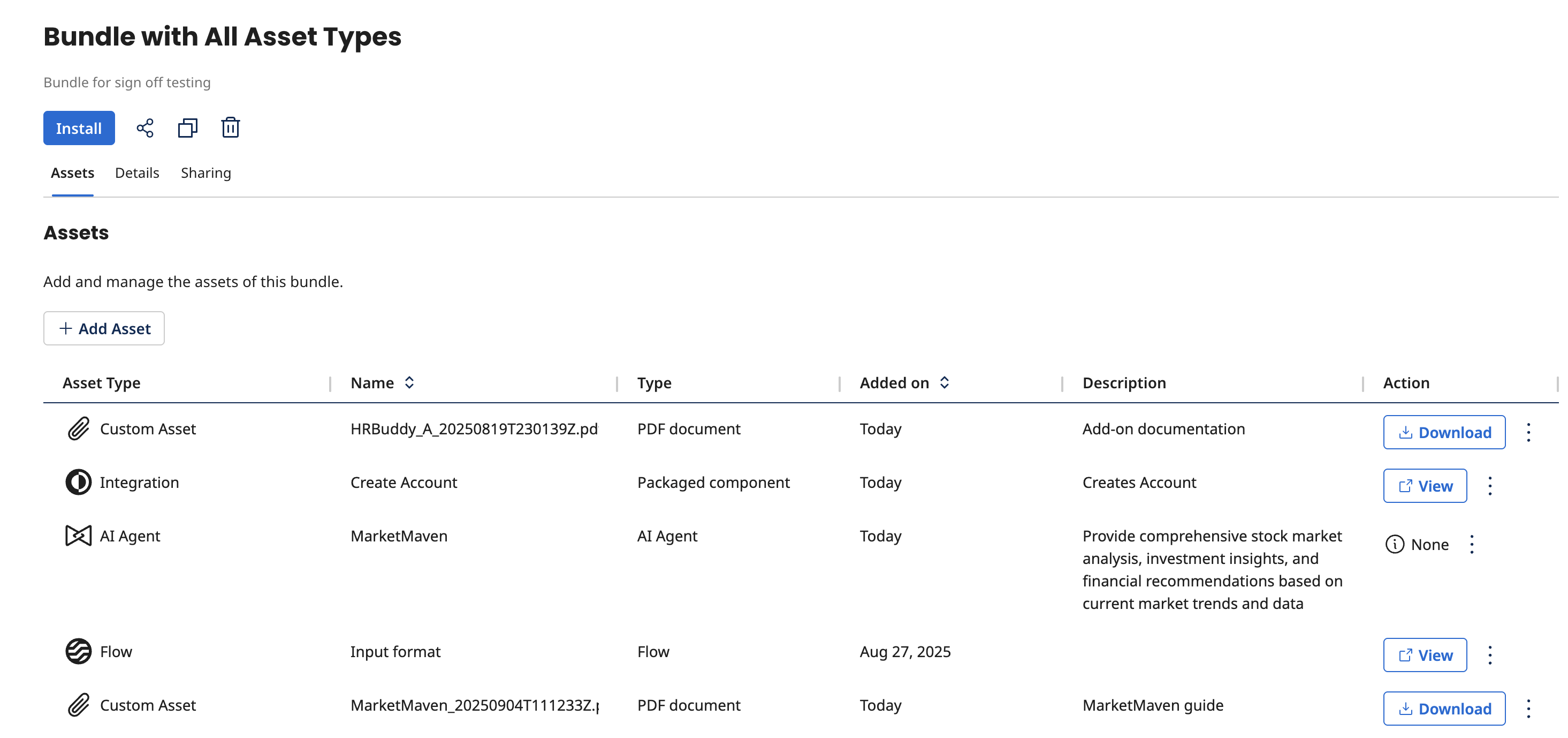 Assets are objects, such as Integration, Flow, AI Agents, and Custom Assets, that can be added to a bundle.