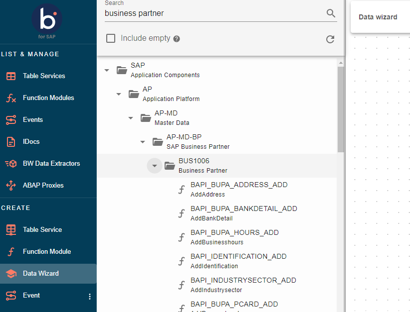 Data Wizards are based on SAP's integrated and managed BAPIs (Business API). Each BAPI consists of function modules focused on specific business domains or objects, enabling tasks such as retrieving the address of a particular business partner. Data Wizards provides SAP users with complete functionality through a user-friendly, interactive list on our platform.