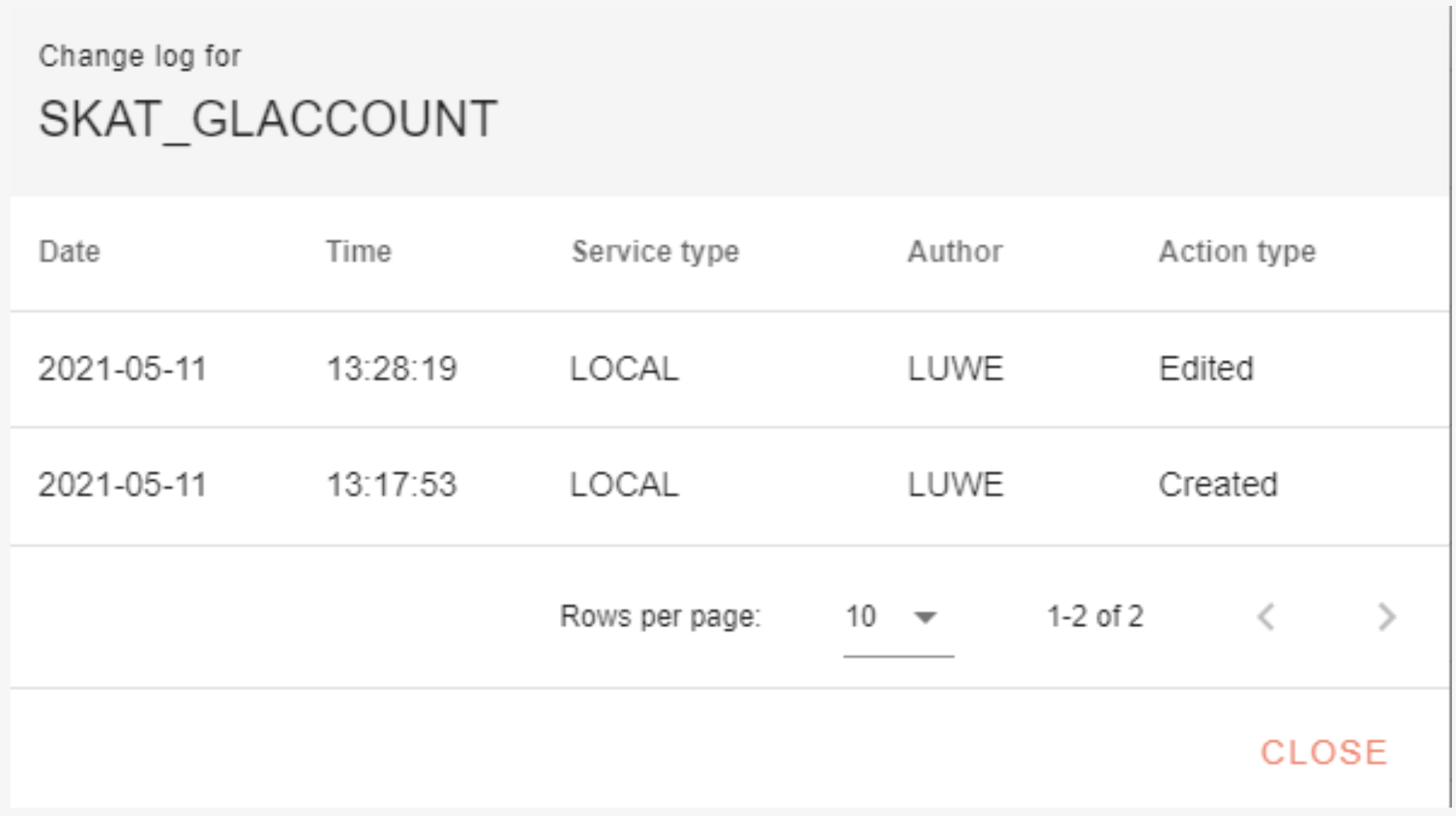 Changelog: Clicking the changelog icon opens a pop-up window with information about the creation and edits made to the Table Service.