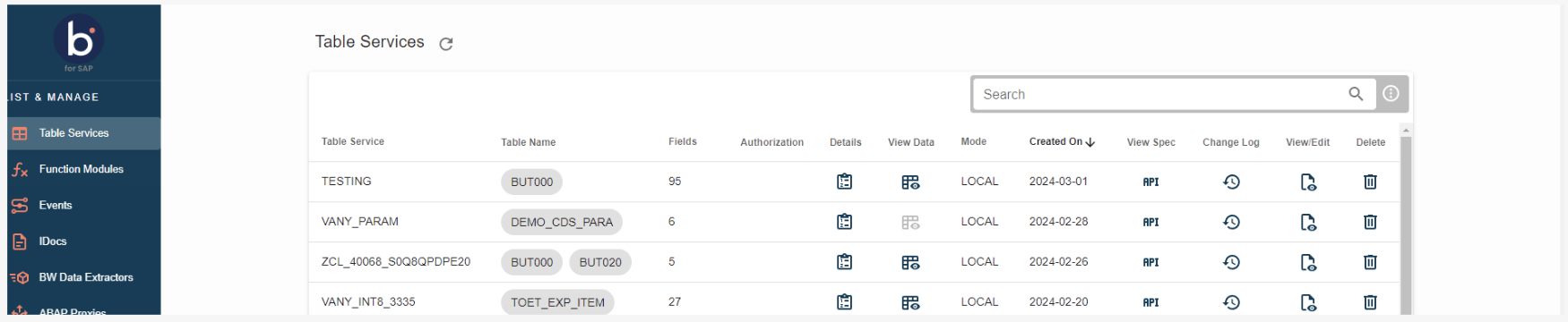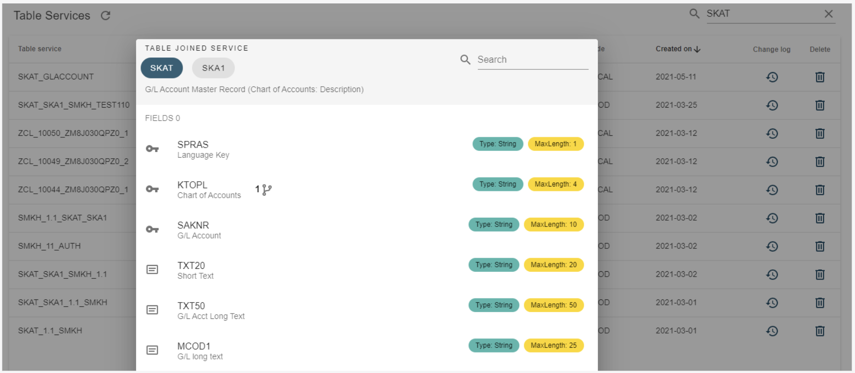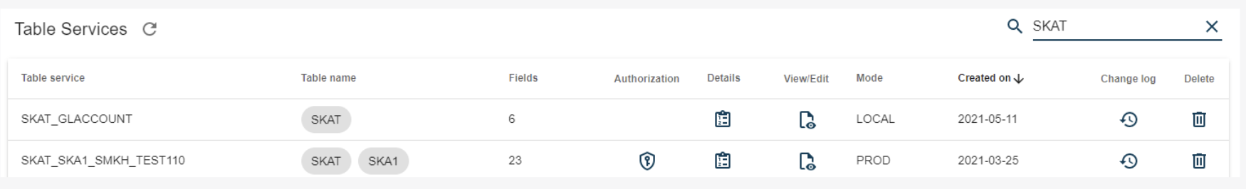 In the above example, the table service includes the table SKAT. The search field in the upper right corner lets you search through the fields inside the table service. To return to the Table Services page, click the Close button.