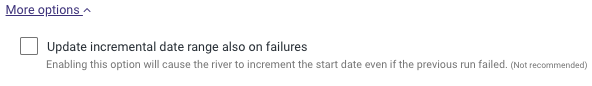If you want to turn off this default setting, click More Options and select the checkbox to advance the start date even if the River run is unsuccessful (Not recommended).