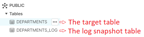 To attach each log snapshot table to its respective table, the same naming convention is used with the suffix _log. For example, if DEPARTMENTS is the table passed to the target using CDC, then DEPARTMENTS_LOG is its respective log snapshot.