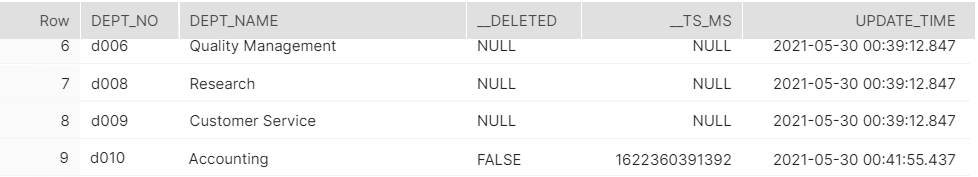 Each action performed on the log snapshot table is added to the table, along with information about when it was changed (recorded under the column __ts_ms) and if it was deleted (recorded under the column __deleted).