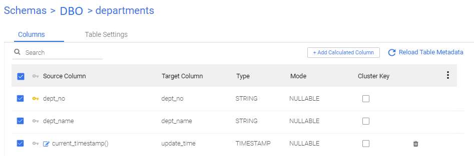 In the DBO.DEPARTMENTS table, there are two columns: DEPT_NO and DEPT_NAME. Additionally, there is a calculated expression in the target's mapping which uses current_timestamp().
