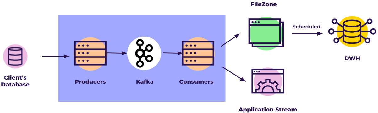 The MySQL connector in Data Integration reads the binlog records and produces change events for row-level INSERT , UPDATE, and DELETE commands into the FileZonefiles. Each file represents a group of operations made in the database in a specific time frame. The data from the log is streamed constantly (in time frames of up to 15 minutes) into the FileZone path specified in the river and pushed into the target according to the river's scheduled frequency. The data is saved first in the FileZone and can then be pushed into the target DWH at any time.