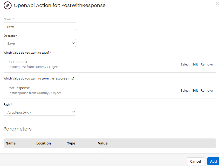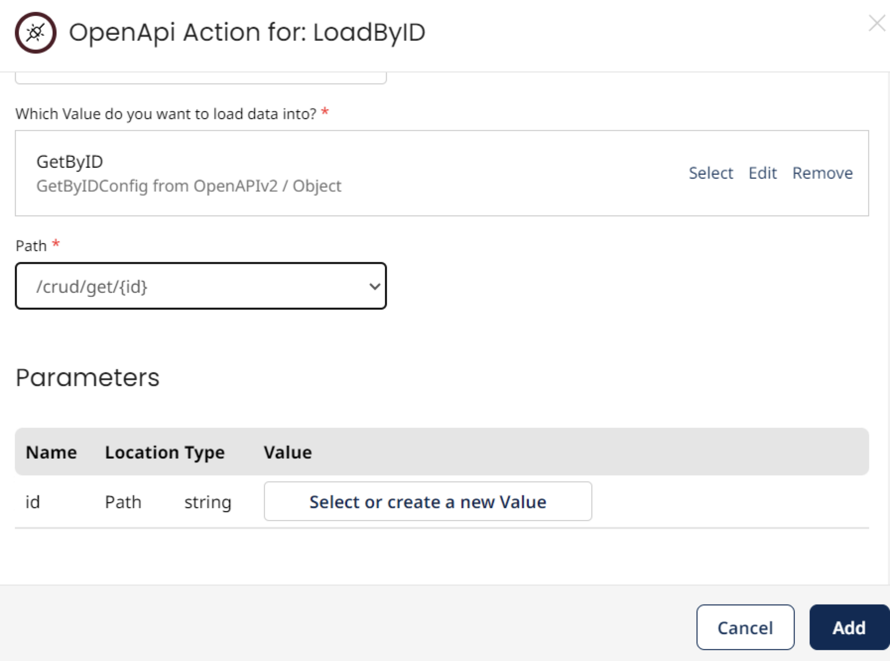Choose the appropriate path that corresponds to the intended request. It prompts you to set parameters if the request requires parameters. Ensure that the parameter values match the requested type; optional parameters do not need a value. Once you set the ID value, as shown in this example, click Add to configure the action. When the flow executes, it reaches the endpoint /crud/get/{id}, substituting {id} with the provided parameter, and stores the returned result in the GetByID value.