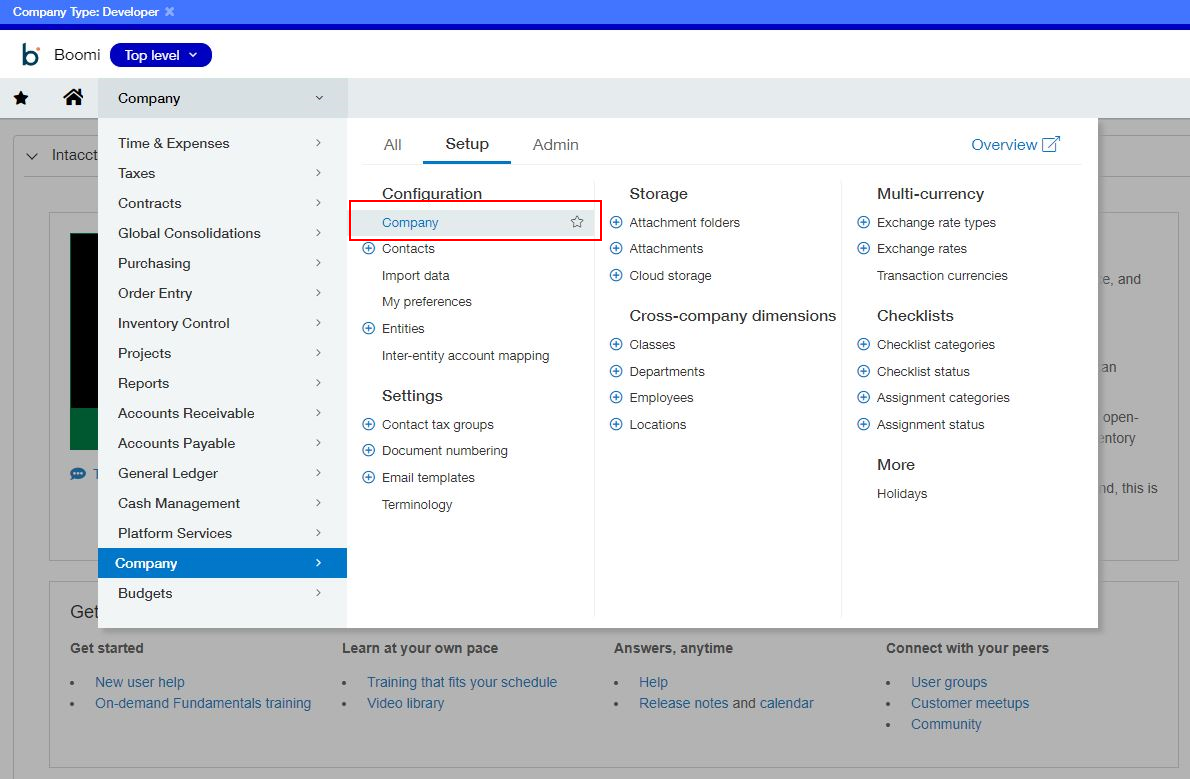 - From the Company submenu, select Setup, then choose Company again.