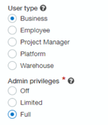 Set your desired roles and privileges for the user's data access needs. For example, if you need to grant full administrator access to a user profile, first add them as a business user with full access.