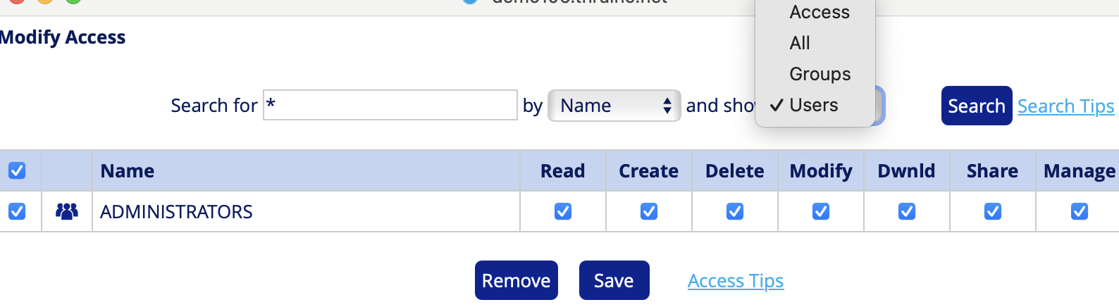 - Select the access rights for the users from each group and click Save.