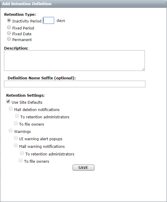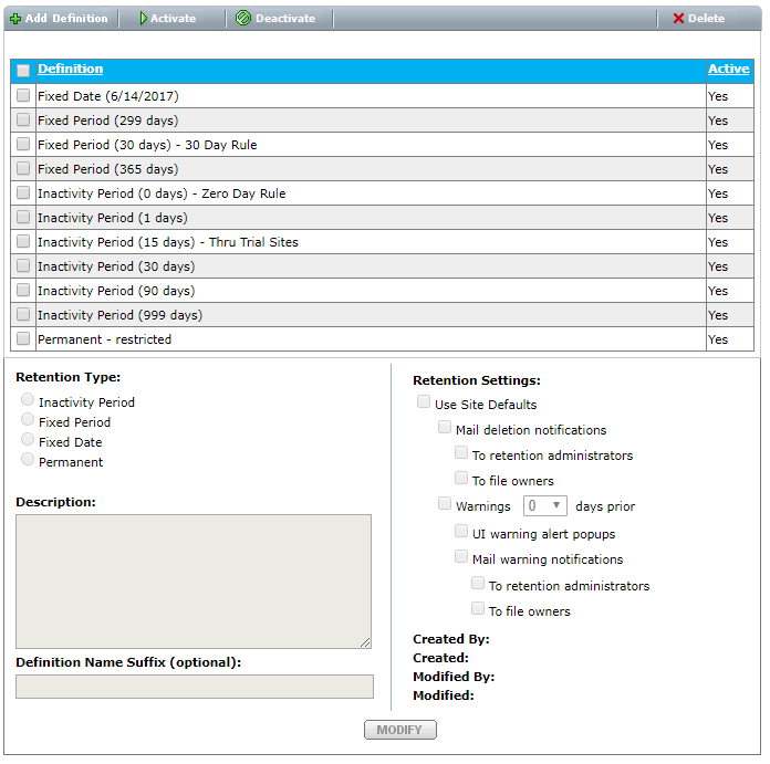 - The schedule part is unique where you can only create one definition for a given retention type plus number of days or date. For example, there can be only one rule for Inactivity Period (3 Days).