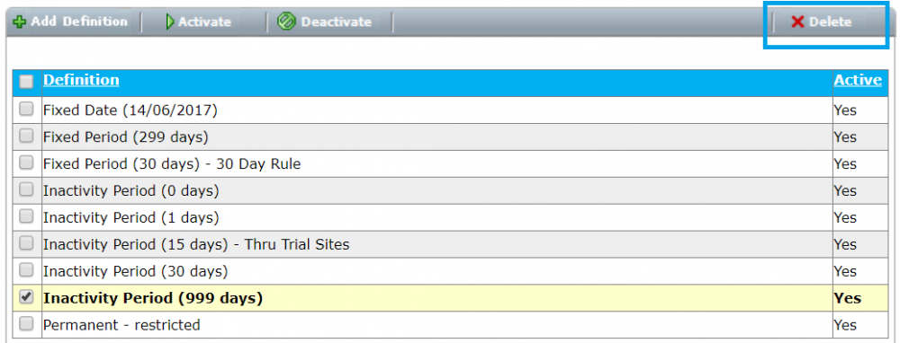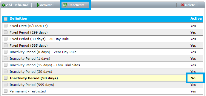Definitions can be deactivated and reactivated from the definition list page. When a definition is inactivated, all the rules with the definition become inactive immediately.