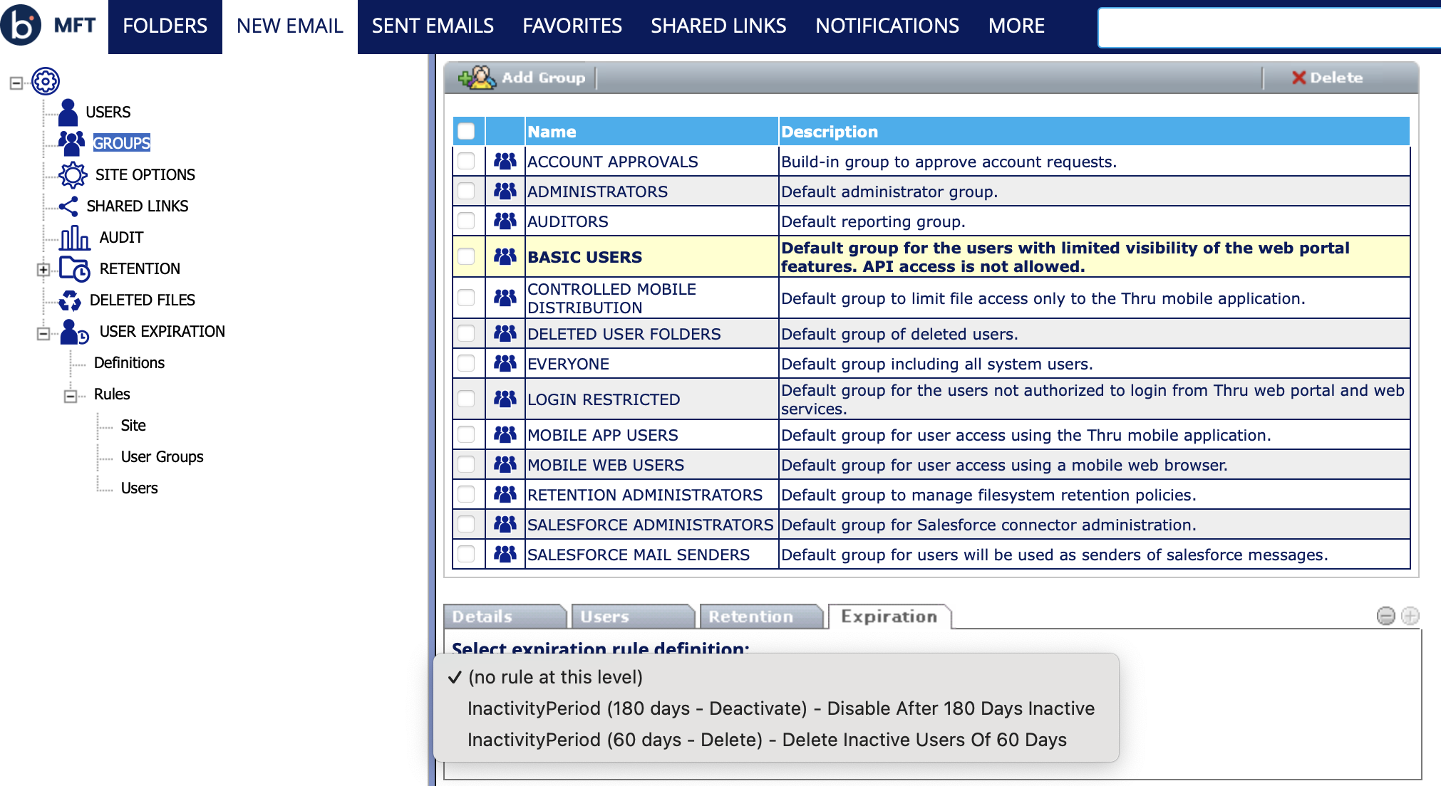 - Select the desired group and click the Expiration tab.