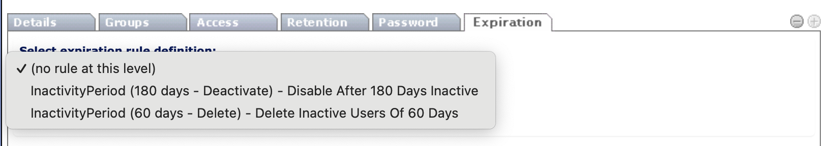 You can assign an expiration definition to a specific user to create a user-level rule.