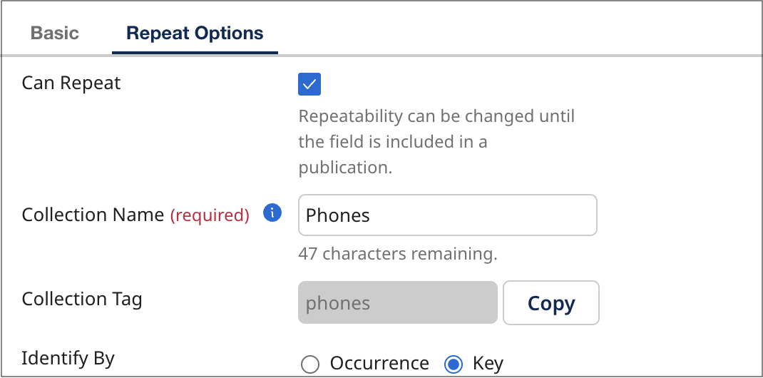 To make the field repeatable, select Can Repeat. Otherwise, turn it off and skip to step 12.
