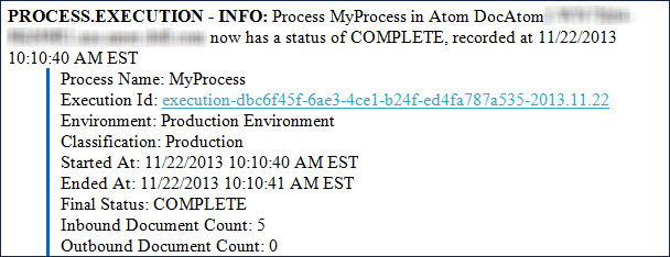 The PROCESS.EXECUTION alert identifies the start and end time for the execution of a runtime's process. The number of inbound and outbound documents are recorded, along with any documents that may have encountered errors during the process execution. The alert includes the process’ execution ID and a link to the execution. Clicking the link takes you to the process on the Process Reporting page. INFO log level alerts always send an execution status if the process runs to completion. Accompanying warning and error alerts can also be logged, depending on your process flow.